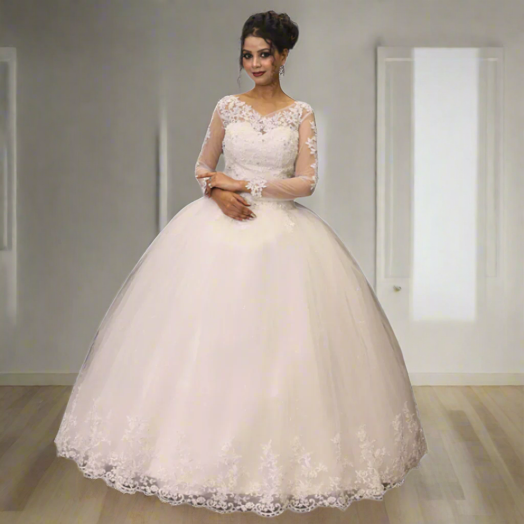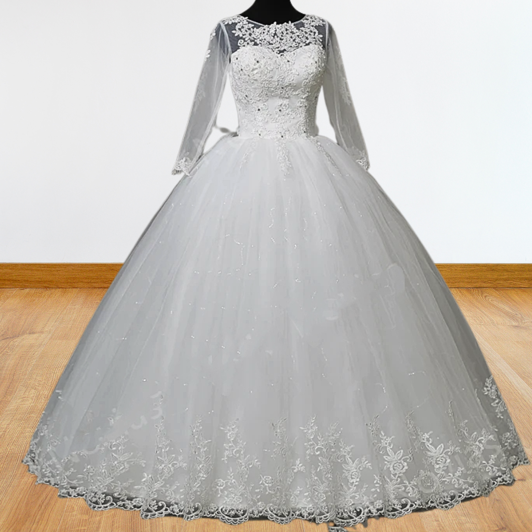Make your special day even more unforgettable with our GownLink White Bridal Ball Gown. This elegant gown features delicate lace detailing on the sleeves and border, perfect for a Christian or Catholic wedding. You'll feel like a true princess in this stunning ball gown.