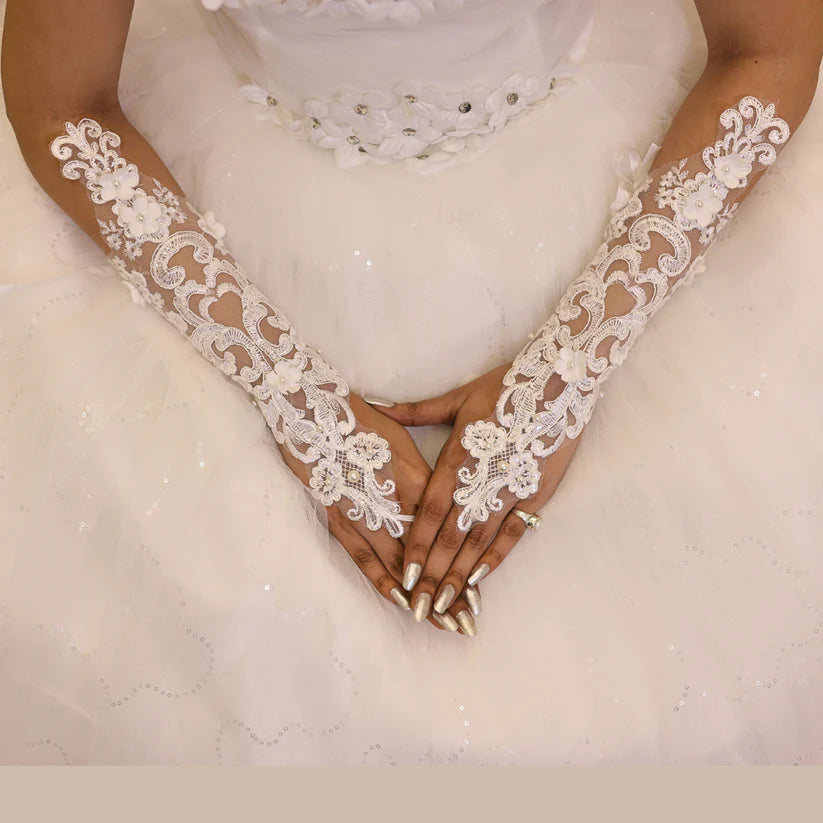 GownLink Lace Gloves Wedding Gloves for Bride Elbow Length Bridal with pearls Gloves G-14