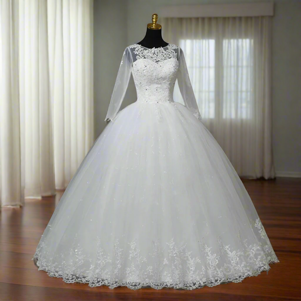 GownLink wedding dress features a white shimmer gown with sleeves. Its elegant design and beautiful fabric will make you the perfect blushing bride for the big day. Crafted with superior quality materials, this exquisite gown is perfect for any Christian or Catholic wedding. Feel beautiful and comfortable throughout your special day.