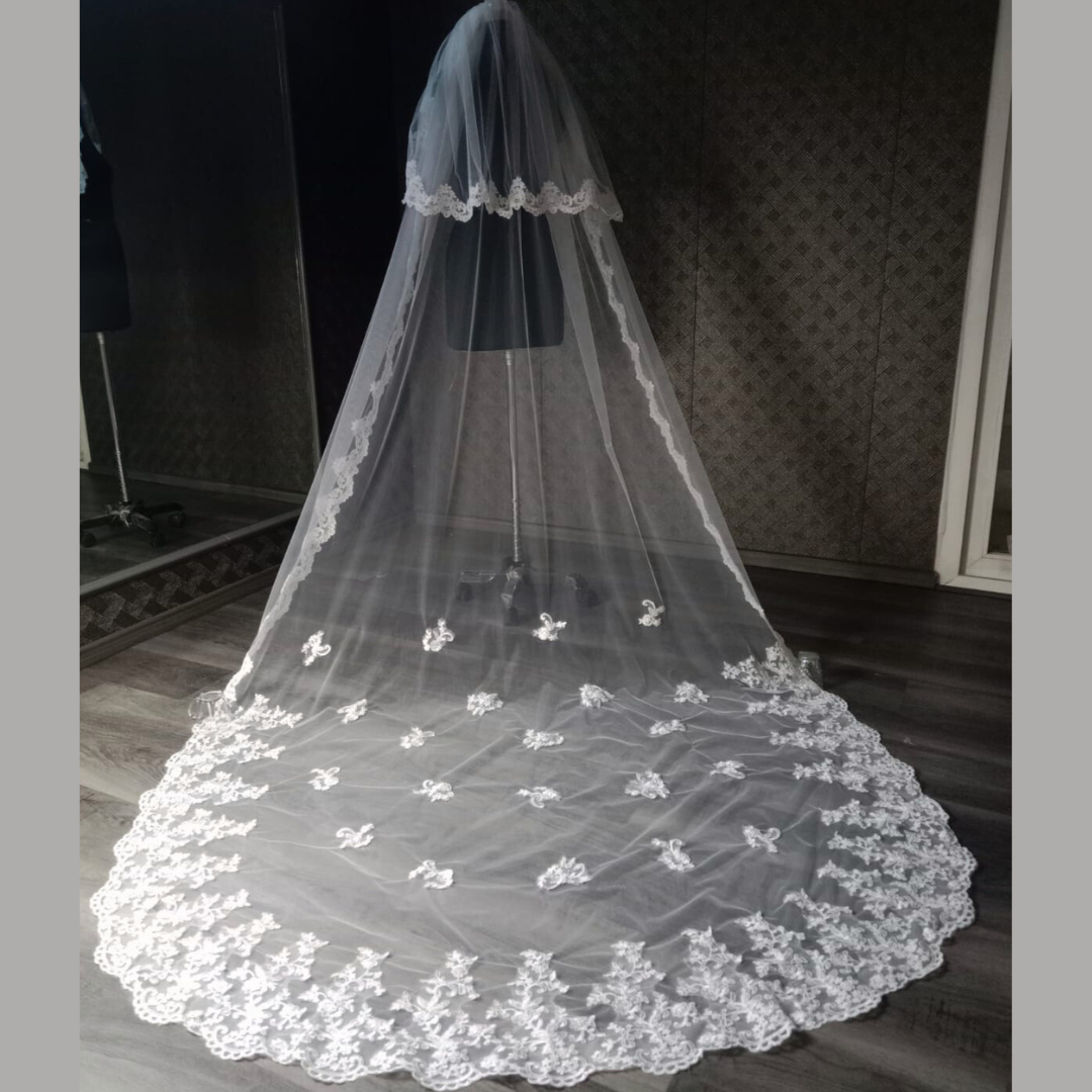 Make a dramatic entrance in this exquisite Angelic Elegance bridal veil. Cathedral length with an added front face layer, you'll be radiant as you walk down the aisle. Complete with comb for effortless styling, perfect for Christian and Catholic weddings.