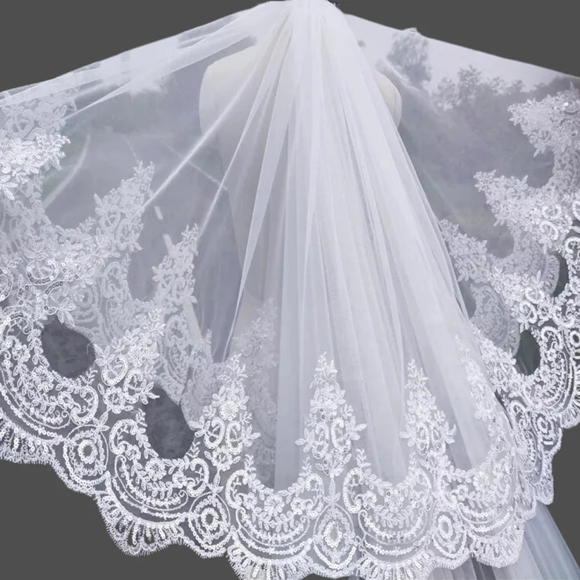 Look majestic on your special day with Majestic Splendor's opulent cascading bridal veil. Crafted from premium materials, it creates the perfect mix of romance and grandeur for your Christian or Catholic wedding. This veil measures 5.5mtrs in length and 130 inches in width. Make a statement with Majestic Splendor.